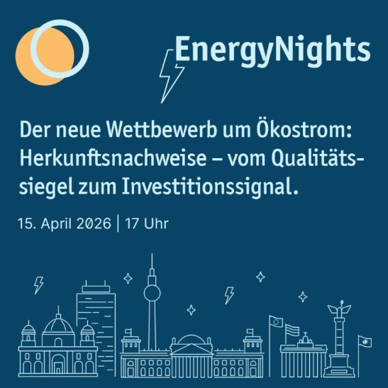Am 15. April 2026 findet in Berlin die LichtBlick EnergyNight statt. Unter dem Titel „Der neue Wettbewerb um Ökostrom: Herkunftsnachweise – vom Qualitätssiegel zum Investitionssignal“ diskutieren Fachleute aus Energiewirtschaft, Politik und Beratung – darunter auch unsere Expertin Dr. Alexandra Styles – aktuelle Entwicklungen rund um Herkunftsnachweise (HKN) und ihre Bedeutung für den Strommarkt.