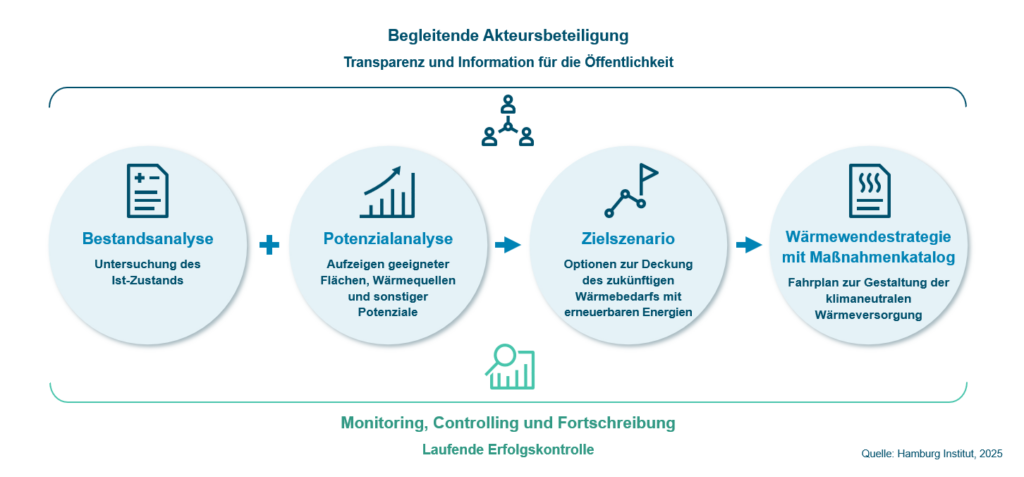 - Zielszenarien: Entwicklung von Zukunftsoptionen, die zeigen, wie die Versorgung in den einzelnen Teilgebieten perspektivisch gestaltet werden kann und welche Formen der Wärmebereitstellung langfristig tragfähig sind.